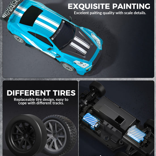 La voiture est dotée d'une coque robuste pour encaisser les bosses et de pneus épais et durables. Vous pouvez faire la course ou déraper, en glissant latéralement comme dans les films, grâce à des pneus remplaçables. Ses phares LED lumineux clignotent à la mise sous tension et un effet de brume rafraîchissante s'échappe à l'arrière lorsque vous appuyez sur un bouton de la télécommande, ce qui lui donne un look magnifique, surtout la nuit. - Temps de jeu et technologie